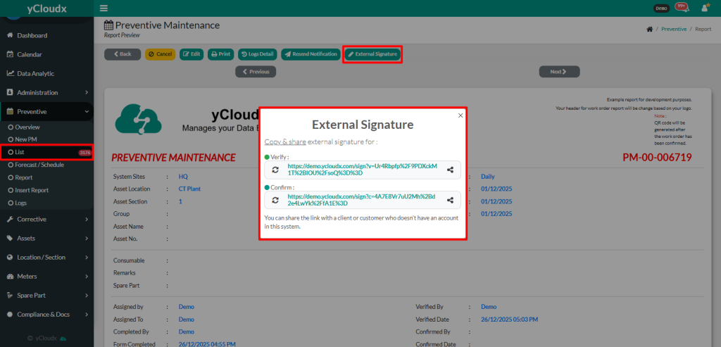 - Proceed to Preventive> List > Verify or Confirm > Select PM Number