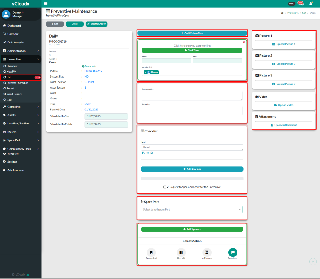 - Proceed to Preventive > List > Open > Click Open button